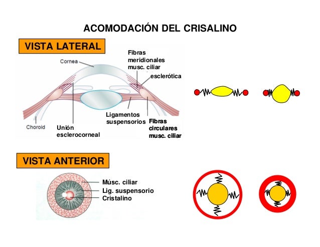 La contracción de cualquiera de los grupos de fibras musculares lisas que forman el músculo ciliar relaja los ligamentos que llegan a la cápsula del cristalino