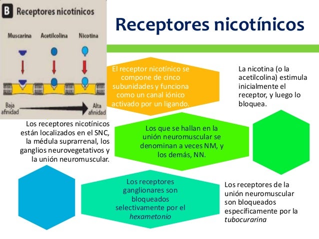- Los receptores nicotínicos: son canales iónicos activados por ligando que se observan en los ganglios autónomos, a nivel de las sinapsis entre las neuronas preganglionares y las posganglionares de los sistemas simpático y parasimpático.