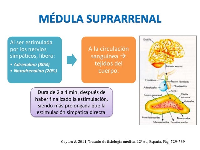 La estimulación de la médula suprarrenal por parte de los nervios simpáticos hace que se libere una gran cantidad de adrenalina y noradrenalina a la circulaciónsanguínea , y estas dos hormonas a su vez se transportan por la sangre hasta todos los tejidos del cuerpo.