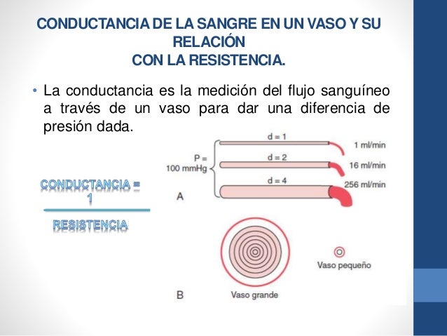 La conductancia es la medición del flujo sanguíneo a través de un vaso para dar una diferencia de presión dada. Esta medida se expresa en milímetros por segundo por milímetro de mercurio depresión, pero también se puede expresar en litros por segundo por milímetro de mercurio o en cualquier otra unidad del flujo sanguíneo y presión.