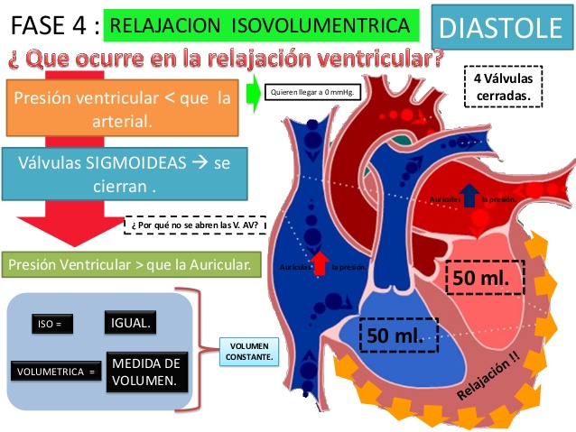 - Fase IV: período de relajación isovolumétrica. Al final del período de eyección se cierra la válvula aórtica, y la presión ventricular disminuye de nuevo hasta el nivel de la presión diastólica. Así, el ventrículo recupera su valor inicial, en el que quedan aproximadamente 50 ml de sangre en el ventrículo y la presión auricular es de aproximadamente de 2 a 3 mmHg.
