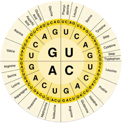 El código genético consta de «tripletes»sucesivos de bases que componen una palabra del código, estos controlan la secuencia de aminoácidos en una molécula proteica que la célula debe sintetizar.