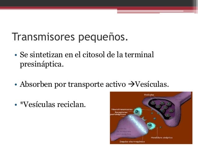 se sintetizan en el citoplasma del terminal presináptico y las numerosas vesículas transmisoras presentes a este nivel los absorben por transporte activo, se liberan en la hendidura sináptica sobre los receptores de la membrana en la neurona postsináptica incrementando o disminuiyendo la conductancia que presentan los canales iónicos