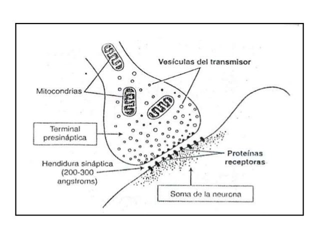 El terminal está separado del soma neuronal postsináptico por una hendidura sináptica en él existen dos estructuras internas de importancia para la función excitadora o inhibidora de la sinapsis: